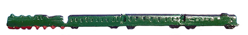 Zug bestehend aus Lok mit Tender und drei Personenwaggons. Größe liegt um die 85 bis 90 mm in unterschiedlichen Bemalungen.