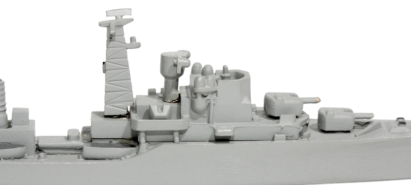 dem Gefechtsturm ein Drahtmast mit Kreuzrah, 5 weitere Drahtmasten. Es