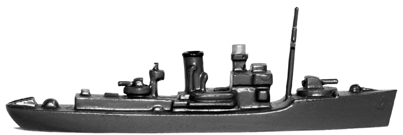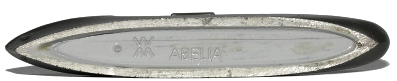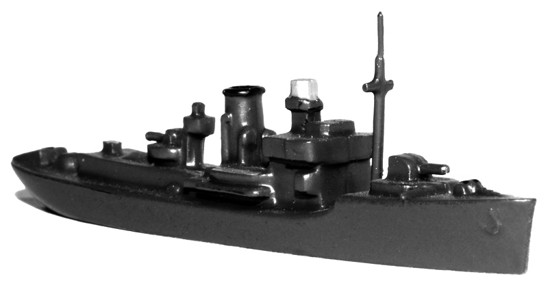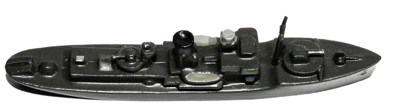 HG, Metall, BP "WM ABELIA". Dunkelgrau, 2 Geschütze, 1 Kunststoffkreuzmast vor der Brücke. Eines der letzten Wiking-Modelle