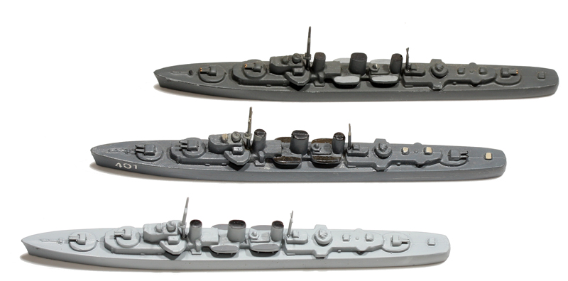 1948 grau bemalt. 3 Zwillingstürme mit gegossenen Einzelrohren, 2 Drahtmasten |